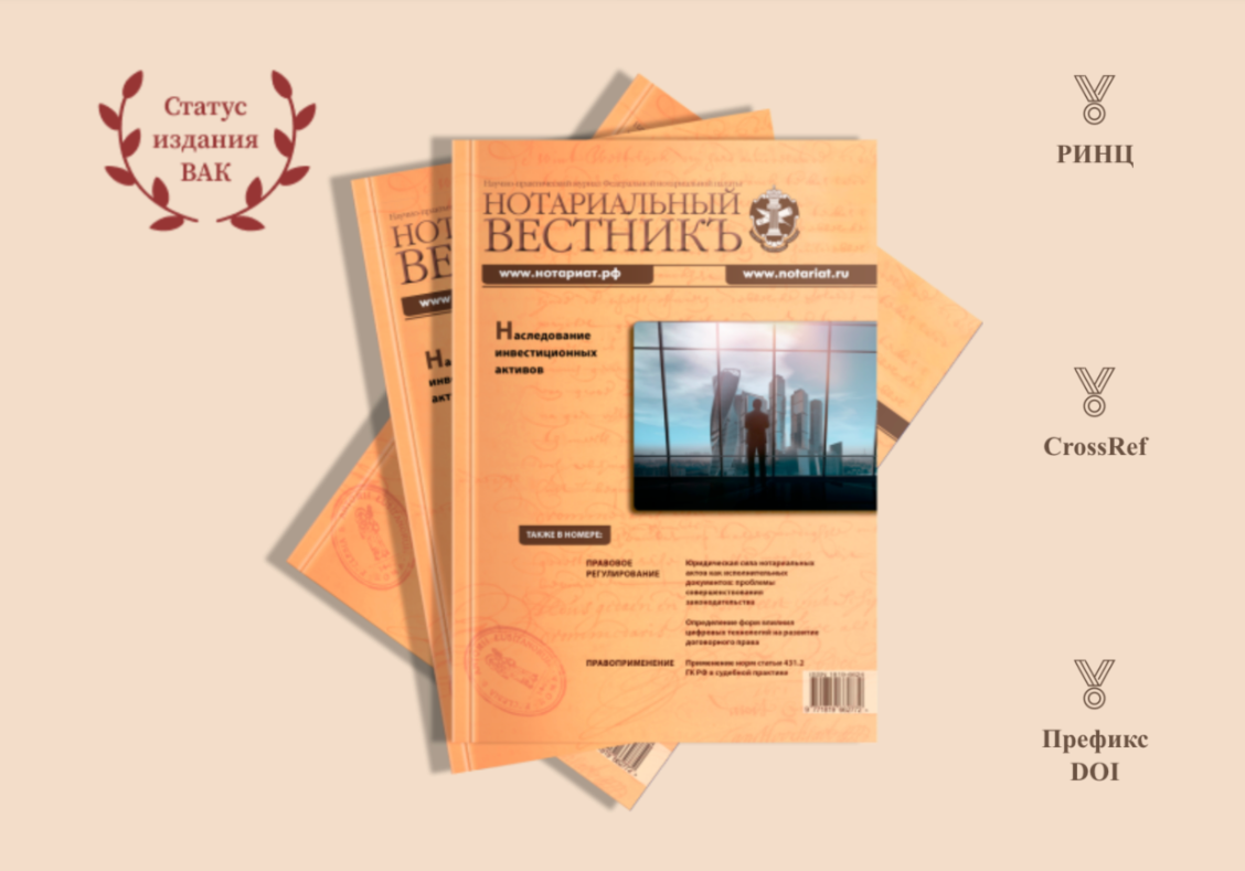 Журнал «Нотариальный вестник» успешно прошел многоэтапную экспертизу, включающую оценку Российской академии наук, и подтвердил соответствие строгим критериям. В частности, учитывались: научное цитирование в изданиях «Белого списка»; публикация рецензируемых научных материалов; соответствие этическим стандартам публикаций; профессиональная репутация главного редактора и редколлегии; наличие сайта с машиночитаемыми метаданными публикаций; присвоение цифровых идентификаторов DOI и др.